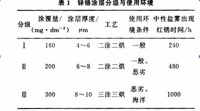 鋅鉻涂層分級與使用環境見表1。