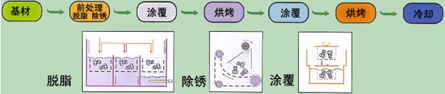 鋅鉻漿液經浸涂、刷涂或噴涂于鐵基零件或構件表面,經320℃左右高溫烘烤,形成裹覆在表面的完整、堅固的防腐層,達到防護目的。